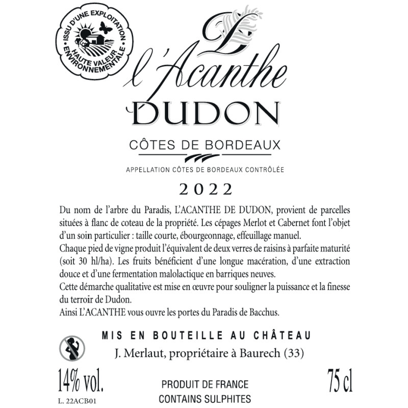 L'ACANTHE de DUDON est élaboré depuis le millésime 2000, les choses ont été poussées à l'extrême sur une parcelle de Dudon, taille courte, éclaircissage, effeuillage manuel, fermentation malolactique partielle en barriques neuves. C'est un vin élégant au nez de fruits noirs et rouges, à la bouche ample, boisée et raffinée que vous pourrez conserver jusqu'à 10 ans les grands millésimes.